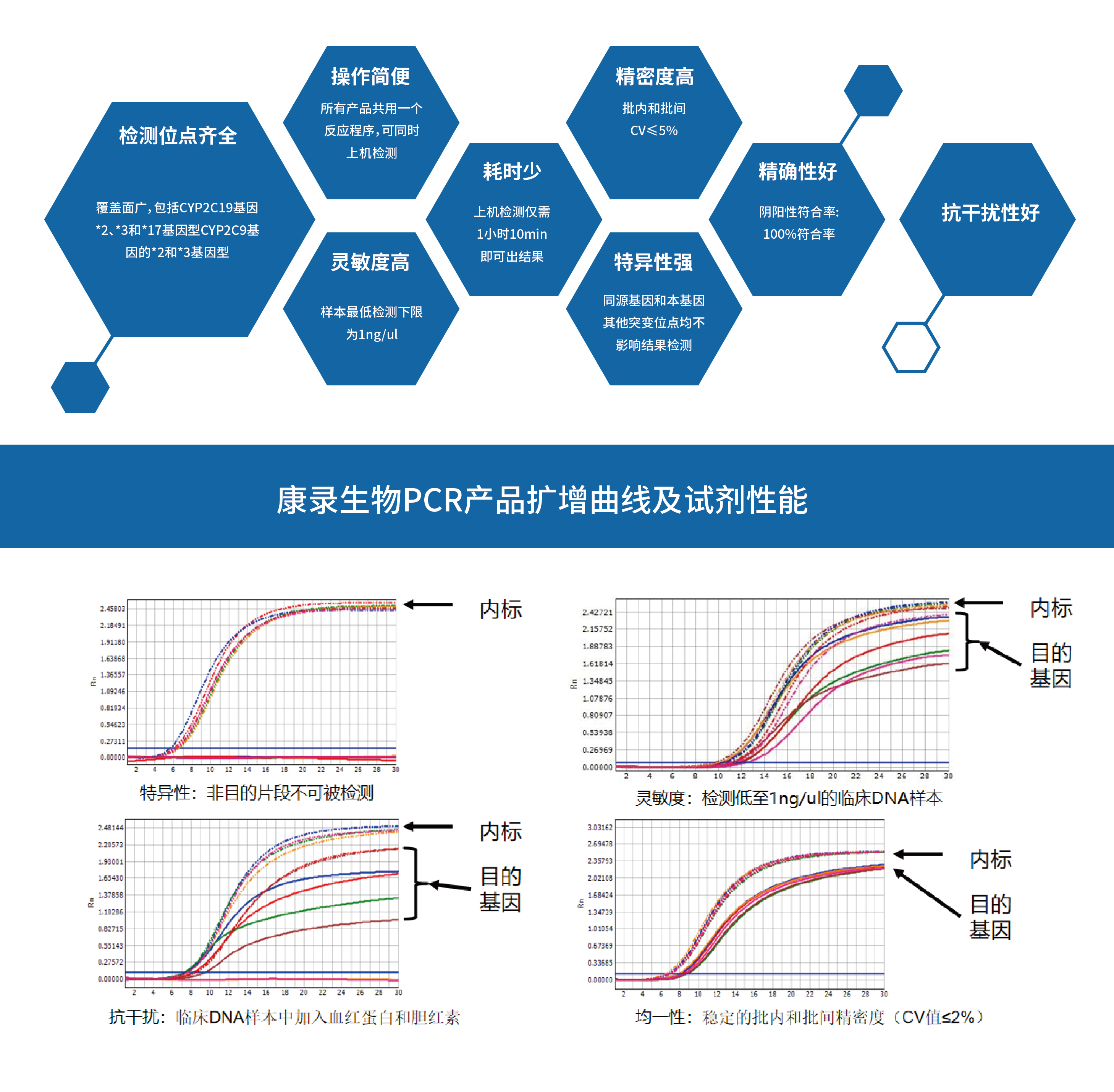 PCR(DNA)检测技术:多重荧光定量PCR技术,该技术基于荧光定量PCR平台,首先针对SNP位点上下游设计特异性引物,分别针对野生型及突变型位点设计不同荧光基团标记的特异性探针,然后对引物及探针进行科学的配比组合,配置SNP位点检测体系,通过荧光定量PCR仪对临床样本DNA进行PCR扩增,同时收集扩增信号,如果信号为野生型探针信号,那么样本为纯合野生型;如果信号为突变型探针信号,那么样本为纯合突变型;如果信号同时有野生型及突变型探针信号,那么样本为杂合突变型。整个检测过程只需要经过PCR扩增一个步骤(上机过程无人工操作),检测时间约为70分钟。