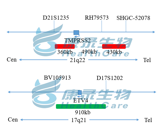 TMPRSS2基因(21q22)标记为橘红色; ETV4基因(17q21)标记为绿色。
