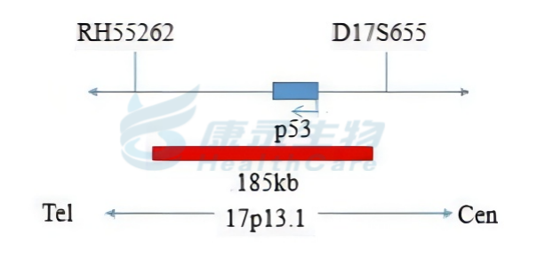P53基因(17p13.1)标记为橘红色; 17号染色体着丝粒(CEP17)标记为绿色。