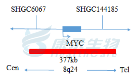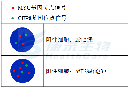 MYC基因(8q24)标记为橘红色,长度为377kb; 8号染色体着丝粒(CEP8)标记为绿色。