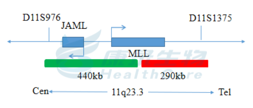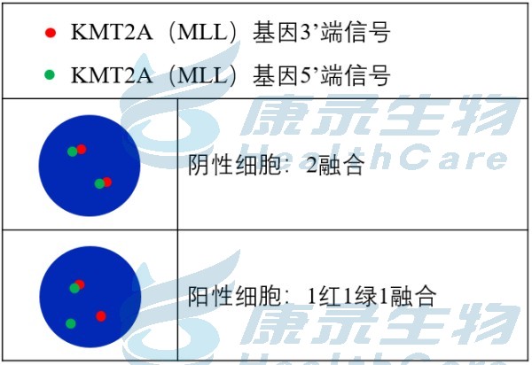 KMT2A(MLL)基因5’端标记为绿色; KMT2A(MLL)基因3’端标记为橘红色。