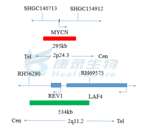 MYCN基因(2p24.3)标记为橘红色,长度为295kb; LAF4基因(2q11.2)标记为绿色,长度为534kb。