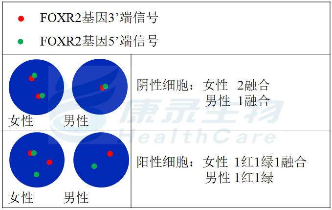 FOXR2基因3’端标记为橘红色; FOXR2基因5’端标记为绿色。