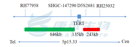 TERT基因5’端标记为橘红色; TERT基因3’端标记为绿色。