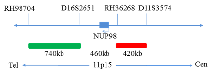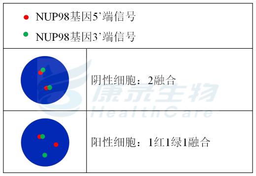 NUP98基因5’端标记为橘红色; NUP98基因3’端标记为绿色。