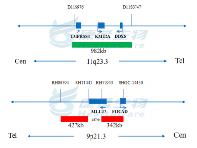 MLLT3基因标记为橘红色; KMT2A基因标记为绿色。