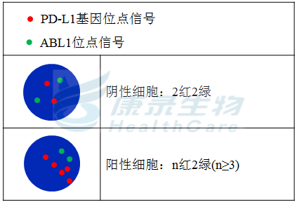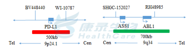 PD-L1基因(9p24.1)标记为橘红色; ABL1基因(9q34)标记为绿色。