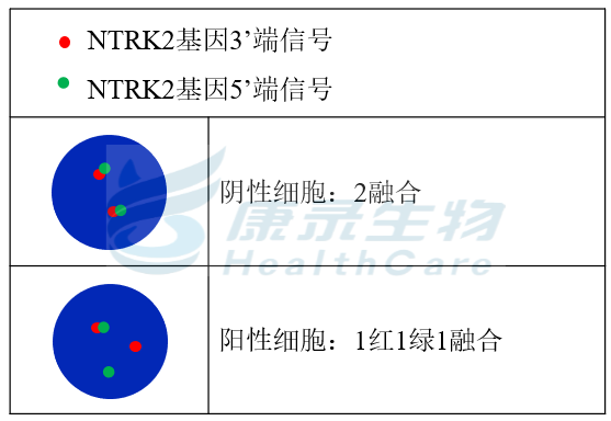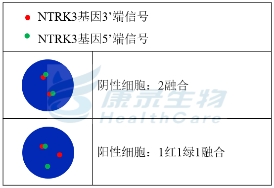 NTRK1基因3’端标记为橘红色; NTRK1基因5’端标记为绿色。 NTRK2基因3’端标记为橘红色; NTRK2基因5’端标记为绿色。 NTRK3基因3’端标记为橘红色; NTRK3基因5’端标记为绿色。