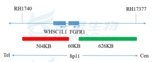 FGFR1基因3’端标记为橘红色; FGFR1基因5’端标记为绿色。