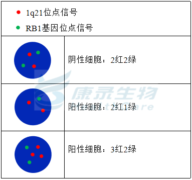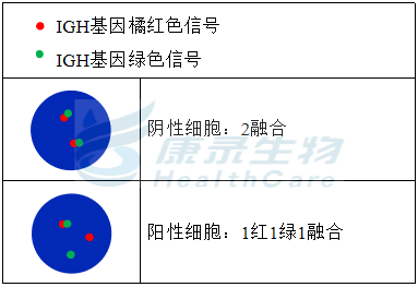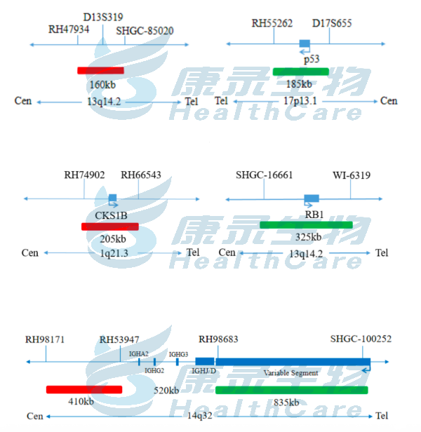 D13S319(13q14.2)标记为橘红色; p53基因(17p13.1)标记为绿色。 RB1基因(13q14.2)标记为绿色; 1q21位点标记为橘红色。 IGH基因近着丝粒端标记为橘红色; IGH基因近端粒端标记为绿色。
