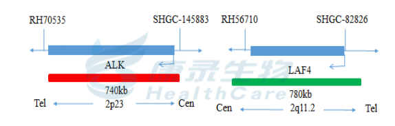 ALK基因(2p23)标记为橘红色; LAF4基因(2q11.2)标记为绿色。