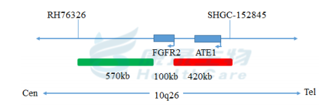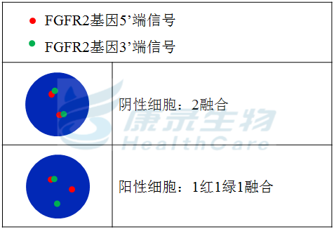 FGFR2基因5’端标记为橘红色; FGFR2基因3’端标记为绿色。