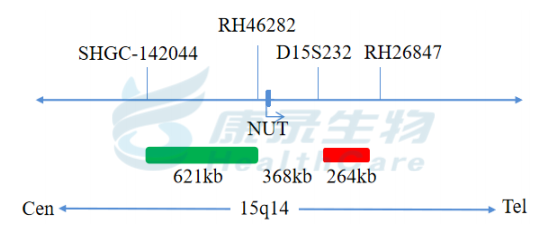 NUT基因3’端标记为橘红色; NUT基因5’端标记为绿色。