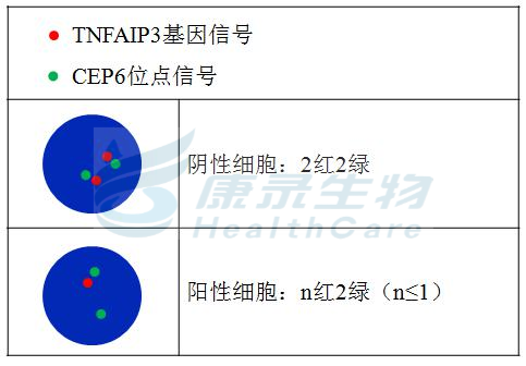 TNFAIP3基因(6q23)标记为橘红色; 6号染色体着丝粒(CEP6)标记为绿色。