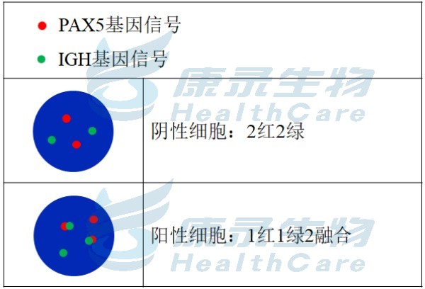 PAX5基因标记为橘红色; IGH基因标记为绿色。