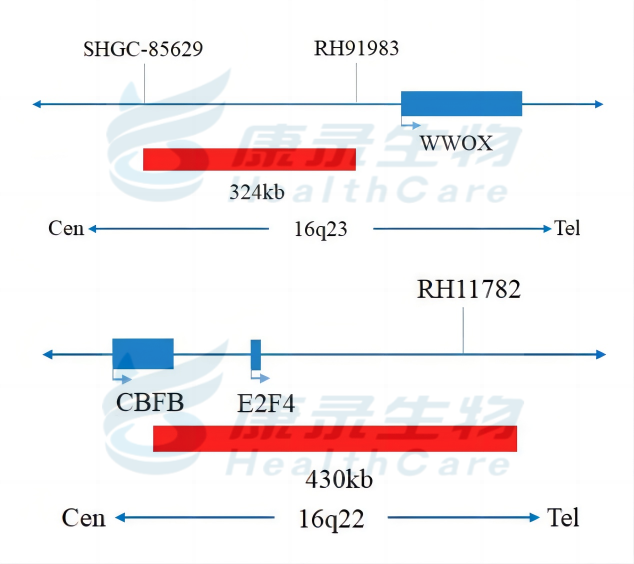 16q22段标记为橘红色; 16q23标记为橘红色。