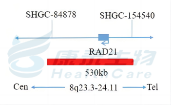 RAD21基因(8q23.3-24.11)标记为橘红色,长度为530kb; 8号染色体着丝粒(CEP8)标记为绿色。