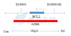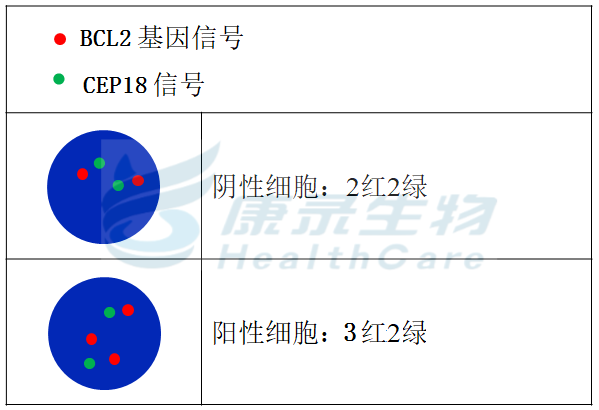 BCL2基因(18q21)标记为橘红色; 18号染色体着丝粒(CEP18)标记为绿色。