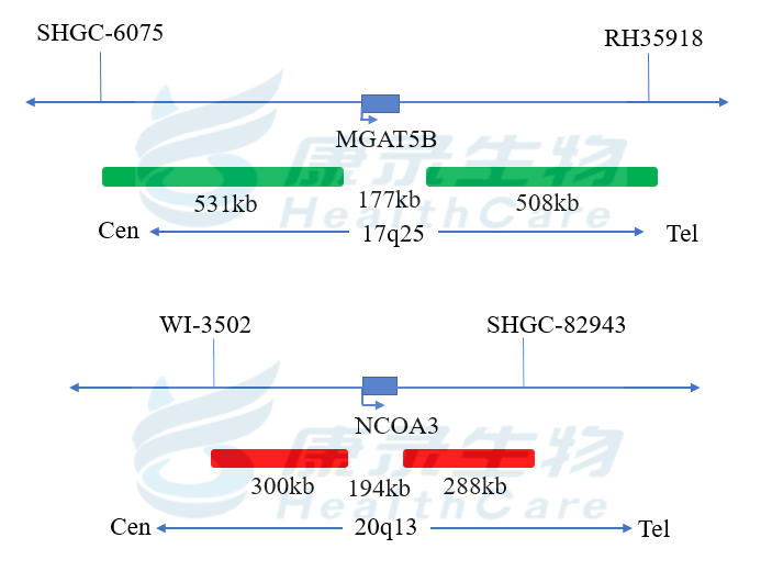 NCOA3橘红色探针;MGAT5B绿色探针。