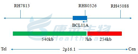 BCL11A基因5' 端标记为橘红色; BCL11A基因3' 端标记为绿色。