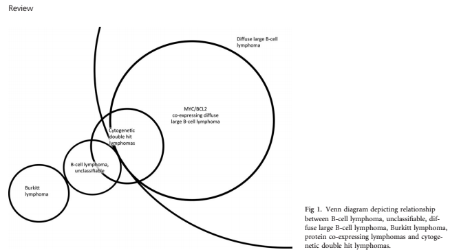Keywords: double-hit lymphoma, diffuse large B-cell lymphoma, B-cell lymphoma unclassifiable, triple-hit lymphoma, MYC. Recurrent chromosomal translocations are common in patients with B-cell malignancies (Yunis et al, 1984; Offit et al, 1991). Such translocations frequently juxtapose oncogenes with immunoglobulin loci and can be considered lymphoma-initiating events. Amongst the best studied of these is MYC; the prototypic example of an MYC-driven lymphoma is rearrangement of chromosome 8q24 in Burkitt lymphoma (BL). When MYC rearrangements occur simultaneously with other translocation partners, such as BCL2 or BCL6, the resultant lymphomas have distinctive biology and highly aggressive clinical behaviour and have been termed double hit lymphomas (DHL). Given the rarity and relatively recent awareness of this entity, prospective clinical trials have proven challenging to perform. As such, most existing data is drawn from retrospective studies or subgroup analyses from prospectively treated cohorts of patients with diffuse large B-cell lymphoma (DLBCL). The purpose of this review is to synthesize these data into a comprehensive, clinically focused overview of this challenging group of lymphomas, covering the biology, diagnostic considerations, clinical features, treatment and prognostic factors.