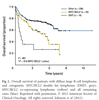 (Ott et al, 2013). MYC/BCL2 co-expressing lymphomas account for 21–34% of DLBCL; their outcomes appear inferior to non-overexpressing cases but not as poor as cytogenetic MYC/BCL2 DHL (Green et al, 2012a,b; Johnson et al, 2012; Kluk et al, 2012; Hu et al, 2013; Valera et al, 2013; Fiskvik et al, 2014; Perry et al, 2014; Yan et al, 2014; Zhou et al, 2014) (Fig 2). The precise cut-off for a positive result has varied slightly between studies, but ≥40% for MYC-IHC and ≥70% for BCL2-IHC are typical (Green et al, 2012a; Johnson et al, 2012; Hu et al, 2013). Whether overexpression of MYC, BCL2 or BCL6 in isolation is adversely prognostic remains a subject of debate due to inconsistencies in the existing literature. In several studies, over-expression of MYC or BCL2 protein has not had a negative impact on survival (Green et al, 2012a; Johnson et al, 2012; Hu et al, 2013), however, in other studies, over-expression of MYC, BCL2 or BCL6 protein was adversely prognostic (Horn et al, 2013;