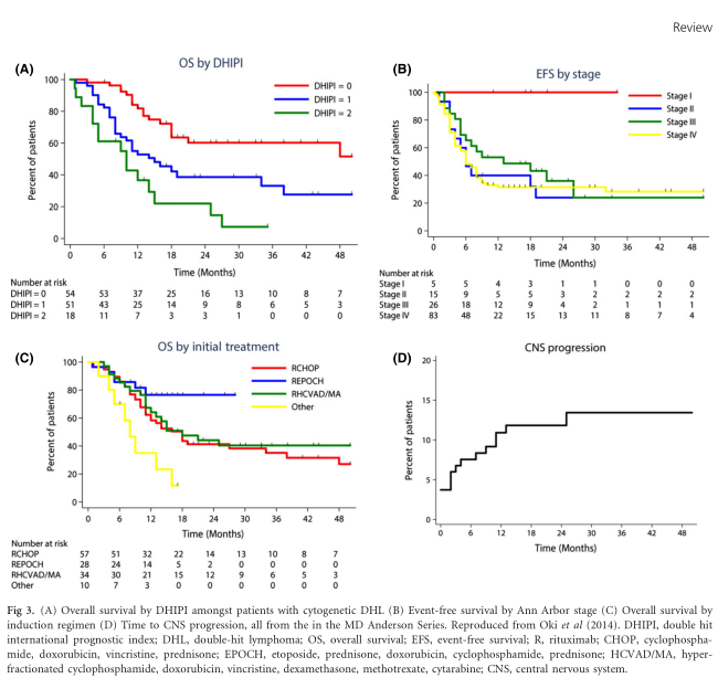 Patients with cytogenetic MYC/BCL2 DHL have an aggressive course with poorer responses to standard therapies and shorter progression-free (PFS) and overall survival (OS) compared with MYC germline DLBCL, independent from clinical risk factors (Klapper et al, 2008; Johnson et al, 2009). The IPI has some prognostic relevance in DHL but limited discriminatory power, as elevated LDH, multiple extranodal sites of involvement and advanced stage are common – therefore most are categorized as high-risk (Petrich et al, 2014). Several other potential prognostic factors have been explored, however, given almost all reported series have been small, single centre and retrospective, findings have been somewhat inconsistent. Nonetheless, some common themes emerge. Two studies have found DHL patients with a MYC-IGH translocation partner (compared with non-immunoglobulin) to be associated with an adverse prognosis (Johnson et al, 2009; Pedersen et al, 2014). One of these studies also identified BCLU morphology as an adverse prognostic factor, however these patients were also more likely to have non immunoglobulin translocation partners and marrow involvement (Johnson et al, 2009). Oki et al (2014) reported the outcomes of 129 patients with cytogenetic DHL treated at MD Anderson Cancer Center (MDACC) anddeveloped a double-hit IPI (DHIPI) using two variables independently significant for adverse OS: performance status ≥2 and bone marrow involvement (Fig 3A). Non-MYC translocation (BCL2, BCL6 or triple-hit lym-phoma) and morphology (DLBCL or BCLU) had no influence on survival. Interestingly, the limited number of patients with stage I disease (n = 5) and grade 3B follicular lymphoma (n = 2) were all alive and free from progression at the time of reporting. Patients with stages II–IV did not have significantly different outcomes (Fig 3B) (Oki et al, 2014). A large multi-centre retrospective collaboration between 23 US academic centres reporting on 311 patients with cytogenetic DHL found white blood cell count >10 9 10 9 /l, LDH ≥ 39 upper limit of normal, stage III/IV and the presence of central nervous system (CNS) involvement to be prognostic (Petrich et al, 2014).