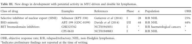 With currently available therapies, the outcome of patients with DHL who either fail to respond to induction or progress after initial response is particularly bleak. Amongst 79 such patients in the MDACC series, the 12-month post-progression survival was 20%, with only two patients (3%) remaining alive beyond 2 years (Oki et al, 2014). Petrich Table III. New drugs in development with potential activity in MYC-driven and double hit lymphomas. Class of drug Examples References Phase n Population ORR Selective inhibitor of nuclear export (SINE) Selinexor (KPT-330) Gutierrez et al (2014) I 28 R/R NHL 25% BH3-mimetic ABT-199 (GDC-0199) Davids et al (2014) I/II 44 R/R NHL 44% BET bromodomain inhibitors GSK525762 NCT01943851 I * R/R haematological cancers * CPI-0610 NCT01949883 I * R/R NHL * ORR, objective response rate; R/R, relapsed/refractory; NHL, non-Hodgkin lymphomas. *Indicates preliminary findings not reported at the time of writing.  et al (2014) reported that, amongst patients who received salvage therapy – typically rituximab, ifosfamide, carboplatin and etoposide (R-ICE) – the median post-progression survival was 17 months.