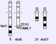 急性髓系白血病M2b形态学和免疫表型表明,细胞核浆发育不平衡现象实际是胞核,胞质的多种蛋白形成紊乱造成的。有研究发现AML1/ETO与这种蛋白紊乱的现象有联系。该研究还发现,基因水平的异常比细胞水平的异常出现的更早、更广泛,因此,基因检测在AML1/ETO阳性急性髓系白血病中非常重要。美国国立综合癌症网络NCCN肿瘤临床实践指南推荐FISH作为AML1/ETO检测方法。