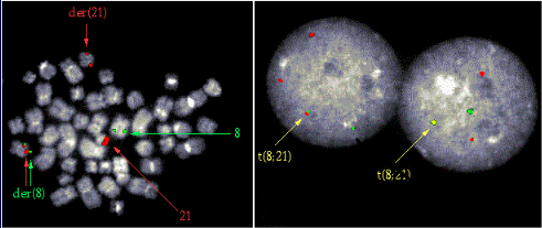 t(8;21)(q22;q22)原位杂交是用荧光染料标记dJ155L8 (RUNX1T1) 和dJ1107L6 (RUNX1 ),检测信号