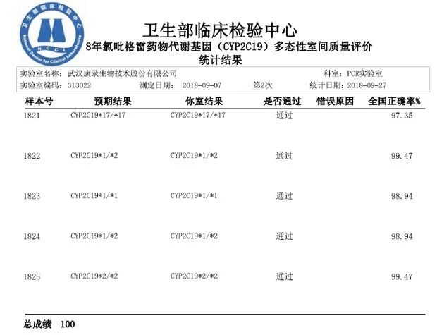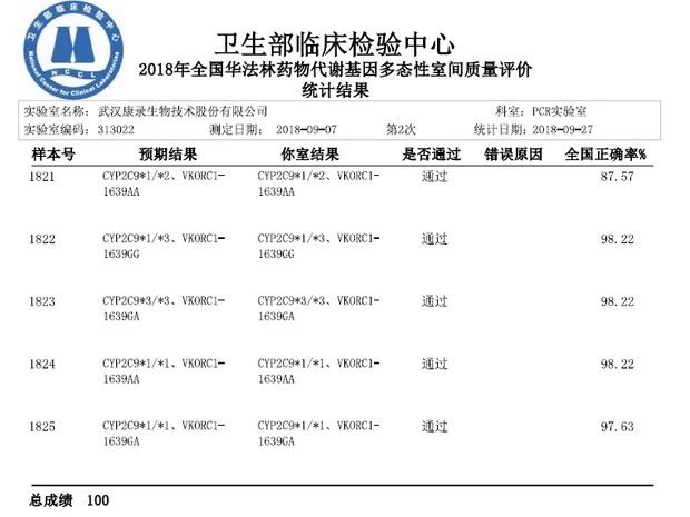 热烈祝贺太阳成集团tyc122cc(以下简称“太阳成集团tyc122cc”)在2018年NCCL第二次室间质评项目中,斩获两项满分!检测项目包括氯吡格雷和华法林药物代谢基因多态性检测室间质评。