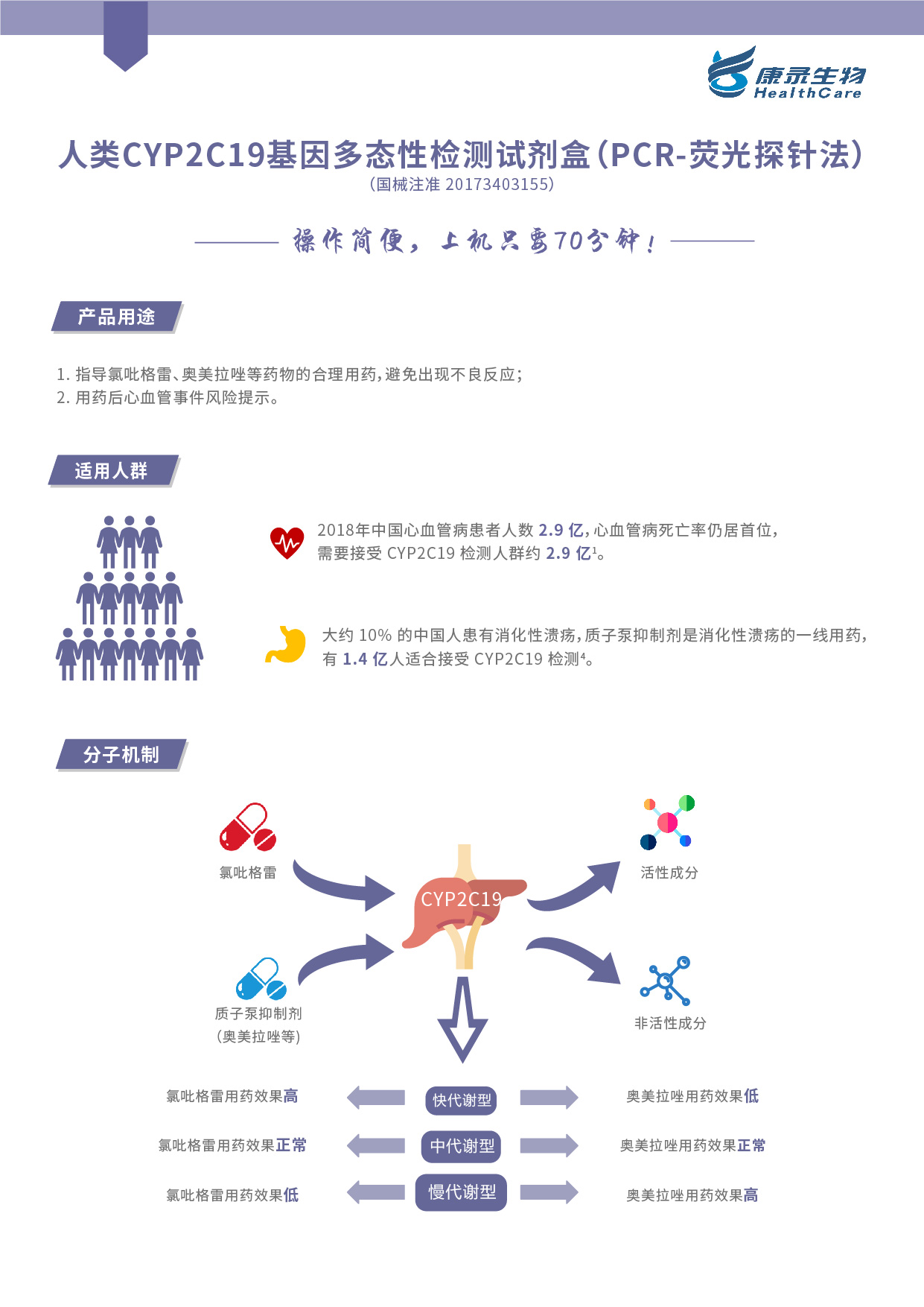 氯吡格雷:CYP2C19基因型与冠心病和缺血性卒中患者的预后具有显著相关性。多项回顾性研究均提示,在服用氯吡格雷的冠心病患者中,携带CYP2C19功能缺失等位基因者与未携带者相比,心血管不良事件的发生率显著升高。TRITON-TIMI38研究的回顾性分析显示,CYP2C19功能缺失等位基因携带者的心血管复合终点事件(指心血管死亡、非致死性心肌梗死、非致死性卒中)发生率增加53%。而PLATO研究显示,接受氯吡格雷治疗的ACS患者中,CYP2C19功能缺失等位基因携带者与未携带者相比,虽然30d的主要心血管终点事件发生率明显增高,但是在12个月的随访终点差异无统计学意义。我国一项研究结果表明,携带CYP2C19基因2个多态位点且PCI术后合并血小板高反应性患者临床缺血事件的发生率显著高于未携带或仅携带1个多态位点且非血小板高反应性患者。另有研究结果表明,检测CYP2C19基因多态性可以预测冠心病预后。在氯吡格雷治疗的缺血性卒中/TIA患者中,携带功能缺失等位基因CYP2C19的患者比未携带患者发生卒中和复合血管事件的风险更高。此外,复发性缺血性卒中组患者的CYP2C19*2等位基因概率远高于无复发缺血性卒中组。在氯吡格雷治疗的缺血性卒中患者中,氯吡格雷低反应性患者的缺血性事件发生率显著升高,表明氯吡格雷低反应性是缺血性血管事件的独立危险因素。在PAD患者中,CYP2C19功能缺失等位基因携带者发生缺血事件的风险增加30%。此外,CYP2C19活性降低的患者,其下肢动脉血管介入治疗的1年通畅率显著降低。这些研究结果表明,对于确诊冠心病、缺血性卒中和PAD等高危缺血患者或者预后不良的患者,可考虑行基因检测和血小板功能检测,给抗血小板药物的使用提供综合参考。