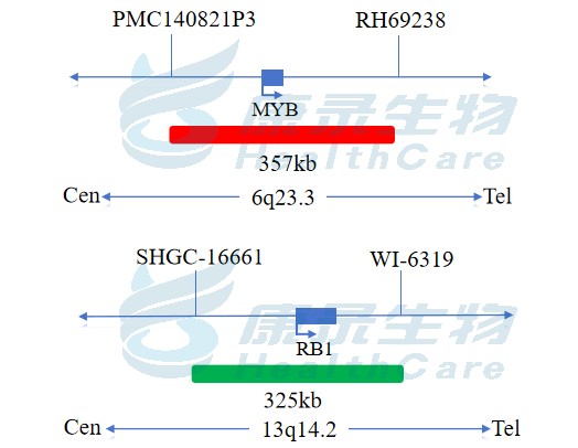 MYB(6q23)橘红色探针;RB1绿色探针