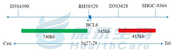 BCL6基因5’端标记为橘红色,长度为458kb; BCL6基因3’端标记为绿色,长度为589kb。