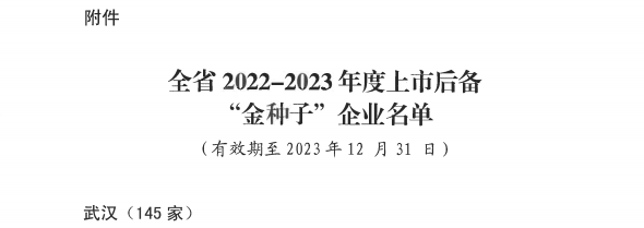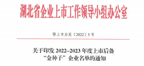 2022年5月27日,湖北省企业上市工作领导小组办公室召开湖北省2022-2023年度上市后备“金种子”企业发布会,会上公布了2022-2023年度省级上市后备“金种子”企业名单和《“金种子”企业上市支持政策清单》,全省共332家企业入选,太阳成集团tyc122cc位列名单之中,成为湖北省上市后备“金种子”企业。